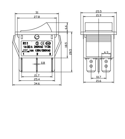 Shanghai Qijia Electronics Co., Ltd. Domů / Produkty / Kolébkový spínač / Kolébkový spínač R11 / R11-22 kolébkový spínač